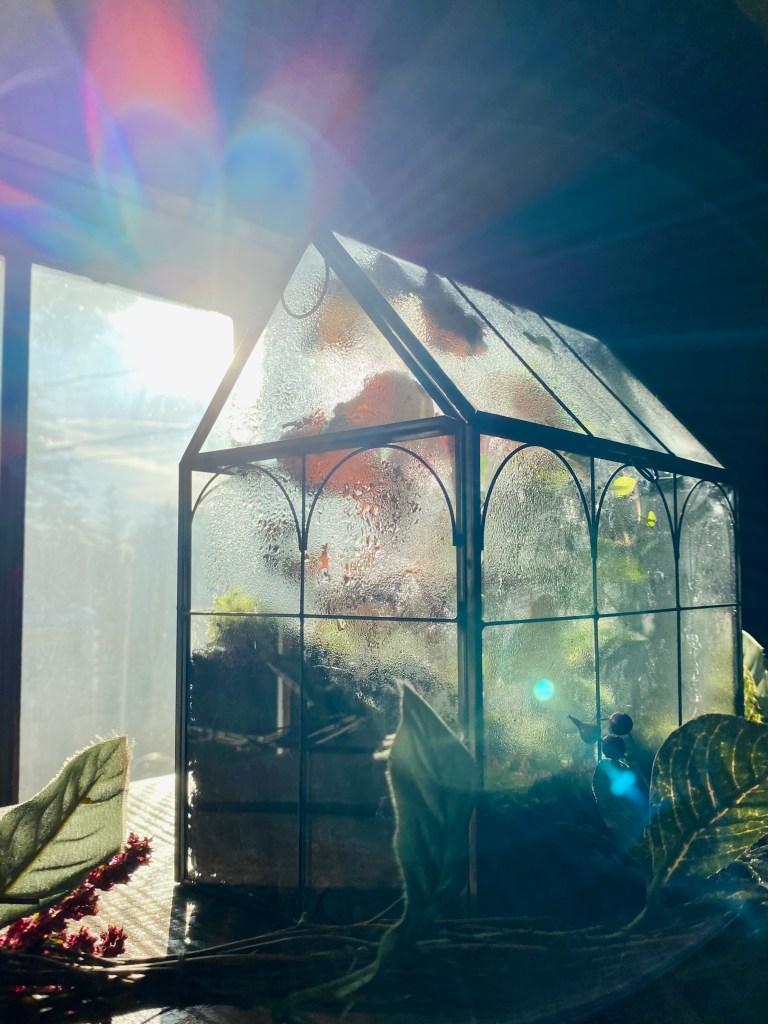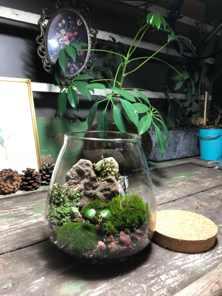 Closed terrariums require little to no maintenance if given the right conditions. If placed within one foot from a southern facing window, the sun will create rainwater within the terrarium, feeding the plants and moss. Keep your terrarium airtight and rotate one-two times a week.